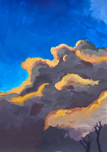 Ciel mon thème ! Le même pour tous mes élèves, enfants, ados ou adultes, de 6 à … ans. Gouache, aquarelle ou acrylique, selon les préférences de chacun.